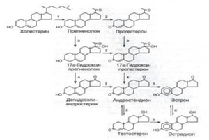 Рис.2. Биосинтез стероидов в яичнике. 1: комплекс фермента, отщепляющего боковую цепь холестерина; 2: 3β-гидроксистероиддегидрогеназа; 3: 17α-гидроксилаза; 4: 17,20-лиаза; 5: ароматаза; 6: 17β-стероиддегидрогеназа.[2]
