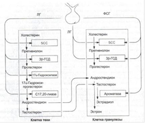 Секреция прогестерона может стимулироваться и ЛГ, и ФСГ, секреция андрогенов увеличивается только под воздействием ЛГ. Образование эстрадиола зависит от обоих гонадотропинов. В то время как ЛГ стимулирует продукцию андрогенов, ФСГ прямо активирует ферментный комплекс ароматазы, который катализирует превращение андрогенов в эстрогены.